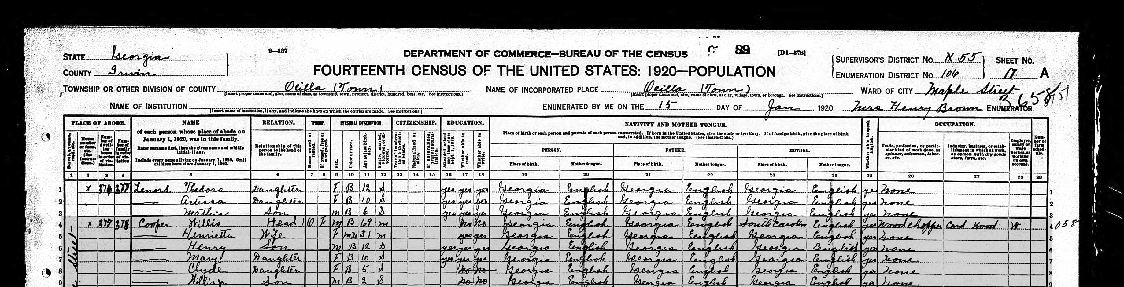Clyde Esther Cooper was born to Willis and Henrietta Cooper in Ocilla, GA on July 16, 1914. According to the 1920 Census, she also had an older brother and sister, Henry and Mary, and a younger brother, Wills Jr. Her father was a wood chopper for Cord Wood.