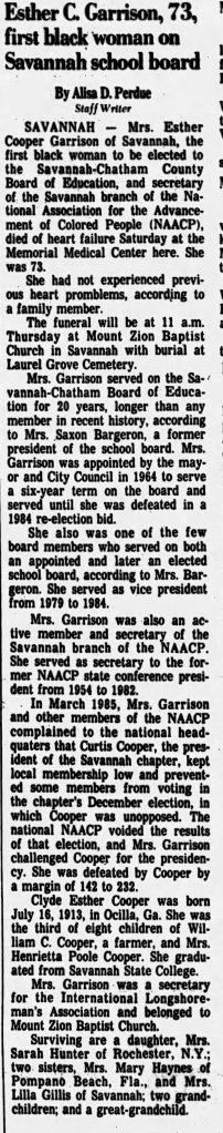 Esther married Leo Garrison and moved to Savannah, where she became extremely active in the community. She was the first Black woman in the Southeast to be elected to a Board of Education, and according to her obituary she served on the Savannah-Chatham County Board of Education for 20 years. She was also the secretary for the Savannah NAACP for 28 years and worked closely with Civil Right leader W.W. Law. Beyond that, she she was the office manager of the international Longshoremen’s Association, according to the Savannah Herald. She was organized, prepared, and steadfast. She was, in essence, the woman who held Savannah together.
