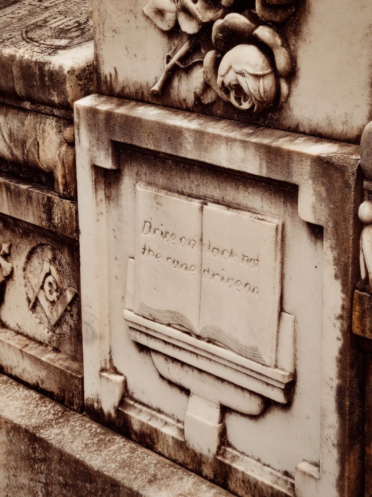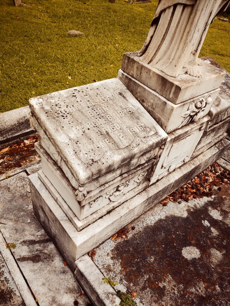 This is the largest headstone in Laurel Grove South Cemetery, so you might think it is it is owned by one of the doctors buried here or maybe one of the land tycoons or big business owners. This gorgeous marble headstone was carved by a famed German sculptor who moved to Savannah, John Walz. He’s probably best known for the Gracie Watson monument in Bonaventure. And who is buried under the lavishly carved monument? A hackman.