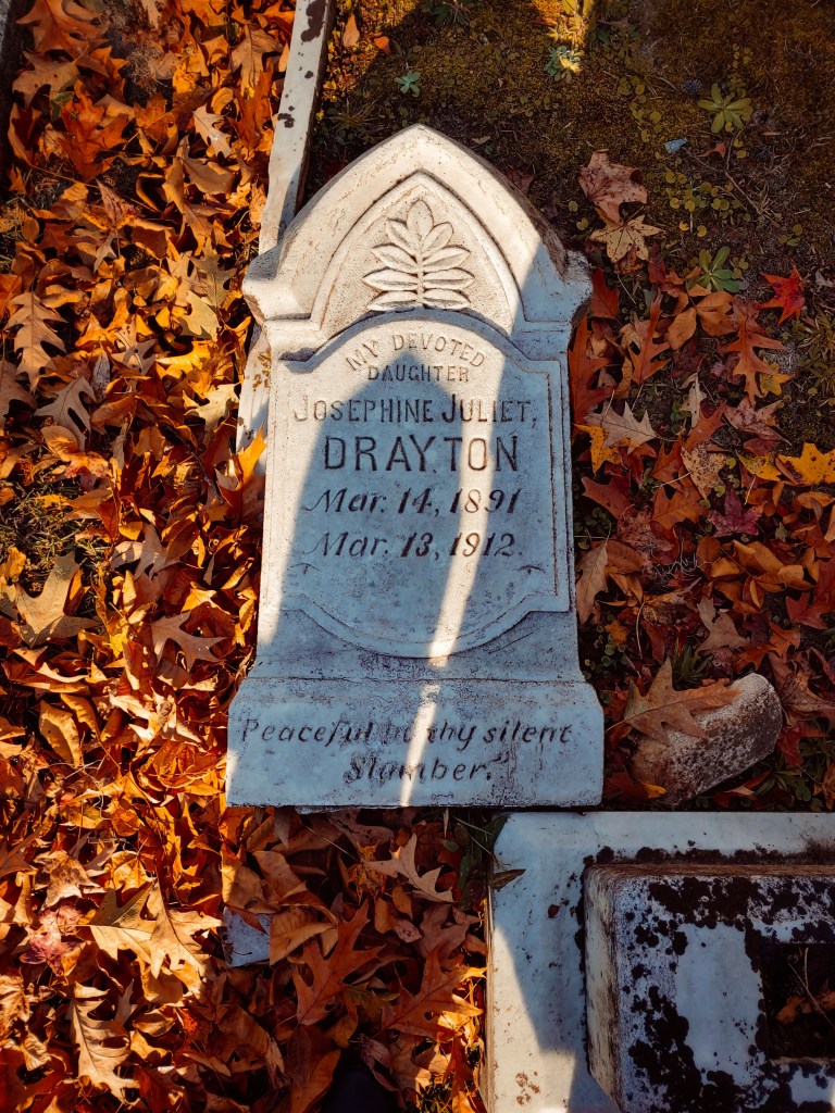 Josephine Juliet Drayton lived with her parents Stephney (also sometimes spelled Stephen) and Georgia Drayton until her death at 21 from Tuberculosis. She also had a half brother, Charlie S. Drayton, born June of 1883, who was the son of Stephney and stepson of Georgia. Stephney and his parents were from South Carolina. He was born May of 1953 and died in 1911. He was recorded in one of the directory records as working as a driver for the J. G. Butler Builder’s Supply Co. He and Georgia married on November 26, 1890. Georgia’s maiden name was Harris, and she was born December of 1865. They all lived together at 515 E. Hall Street.